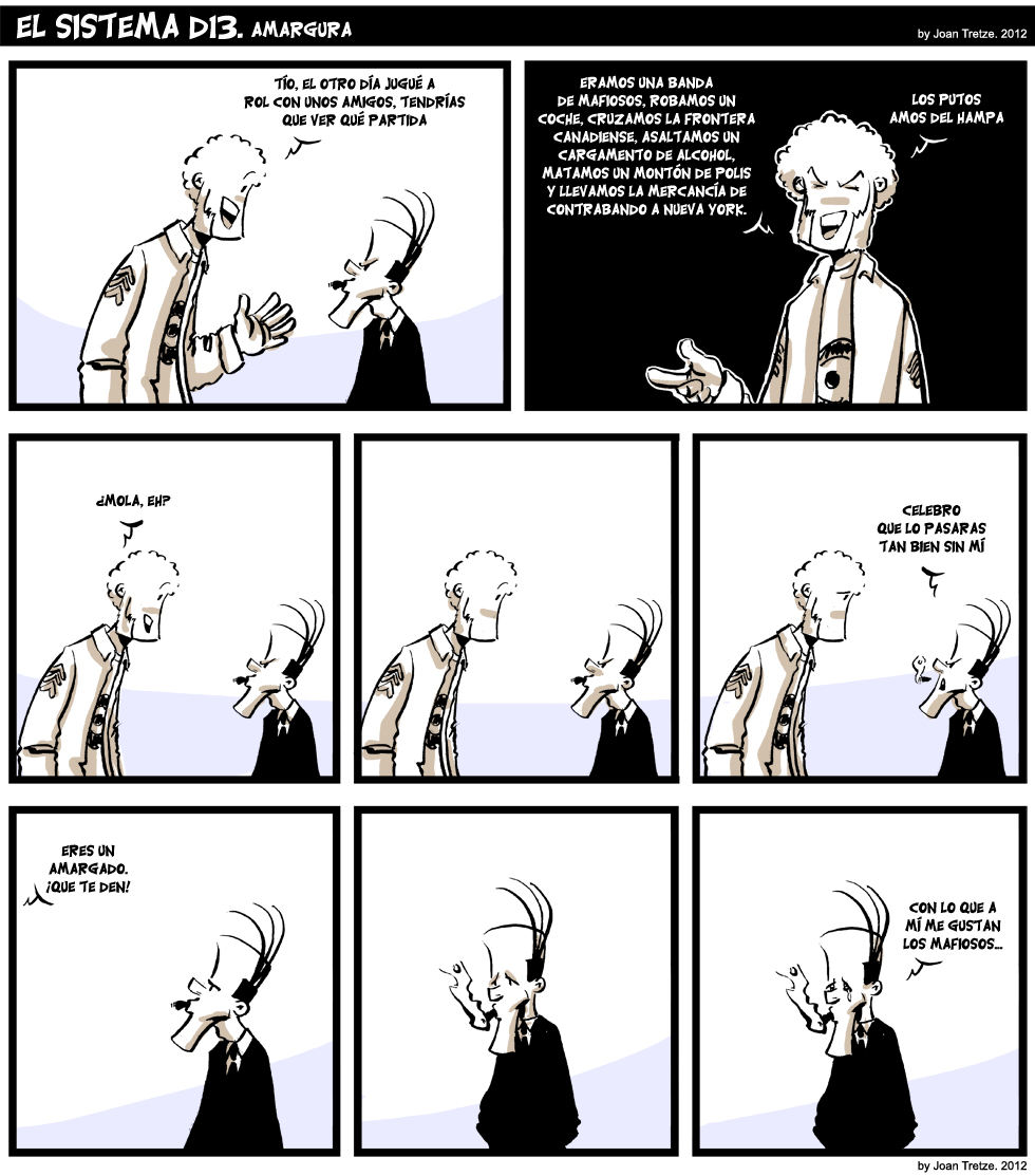 Esta semana no hay tira rolera propiamente dicha pero sí un poquito de rol. La historia aquí contada tiene su razón de ser y es que tuve la suerte de probar el magnífico Omertà que acaba de sacar Holocubierta, un juego en el que interpretas a los malos de la película. La verdad, lo pasé de coña jugando a ser del otro bando.